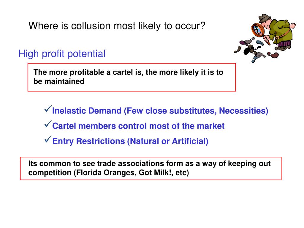 Where is collusion most likely to occur? High profit potential The more profitable a cartel is, the more likely it is to be maintained • Inelastic Demand (Few close substitutes, Necessities) • Cartel members control most of the market • Entry Restrictions (Natural or Artificial) Its common to see trade associations form as a way of keeping out competition (Florida Oranges, Got Milk!, etc)