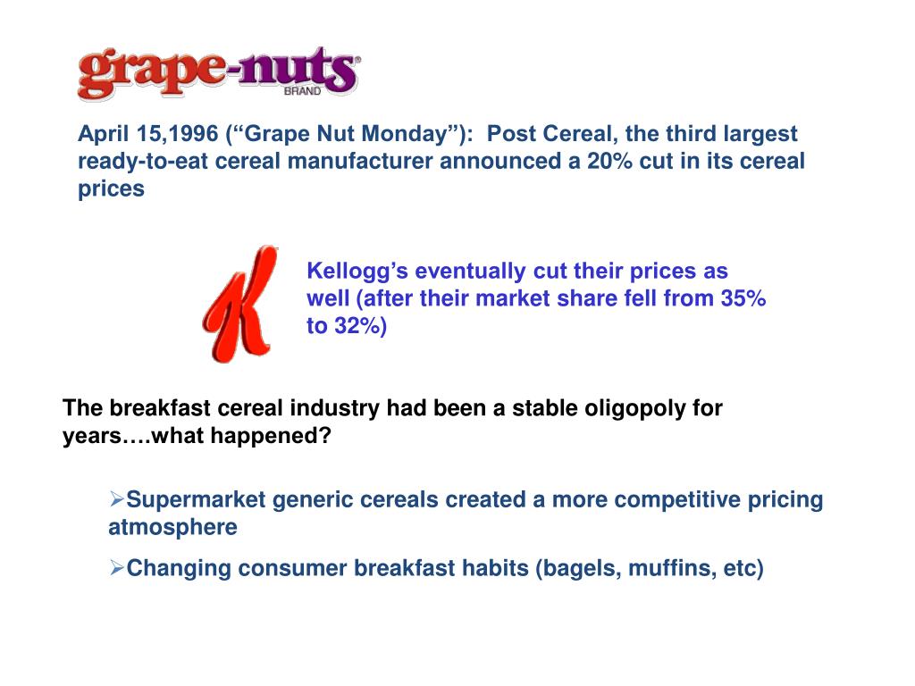 April 15,1996 (“Grape Nut Monday”): Post Cereal, the third largest ready-to-eat cereal manufacturer announced a 20% cut in its cereal prices Kellogg’s eventually cut their prices as well (after their market share fell from 35% to 32%) The breakfast cereal industry had been a stable oligopoly for years….what happened? • Supermarket generic cereals created a more competitive pricing atmosphere • Changing consumer breakfast habits (bagels, muffins, etc)