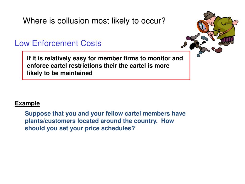 Where is collusion most likely to occur? Low Enforcement Costs If it is relatively easy for member firms to monitor and enforce cartel restrictions their the cartel is more likely to be maintained Example Suppose that you and your fellow cartel members have plants/customers located around the country. How should you set your price schedules?