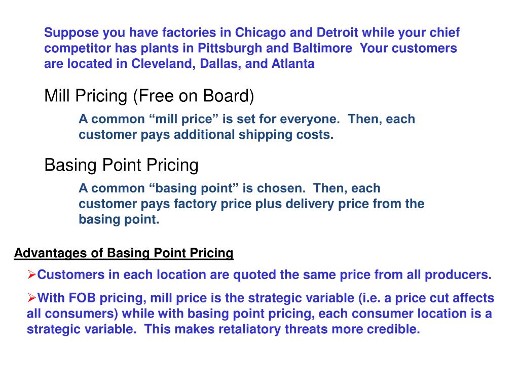 Suppose you have factories in Chicago and Detroit while your chief competitor has plants in Pittsburgh and Baltimore Your customers are located in Cleveland, Dallas, and Atlanta Mill Pricing (Free on Board) A common “mill price” is set for everyone. Then, each customer pays additional shipping costs. Basing Point Pricing A common “basing point” is chosen. Then, each customer pays factory price plus delivery price from the basing point. Advantages of Basing Point Pricing • Customers in each location are quoted the same price from all producers. • With FOB pricing, mill price is the strategic variable (i.e. a price cut affects all consumers) while with basing point pricing, each consumer location is a strategic variable. This makes retaliatory threats more credible.