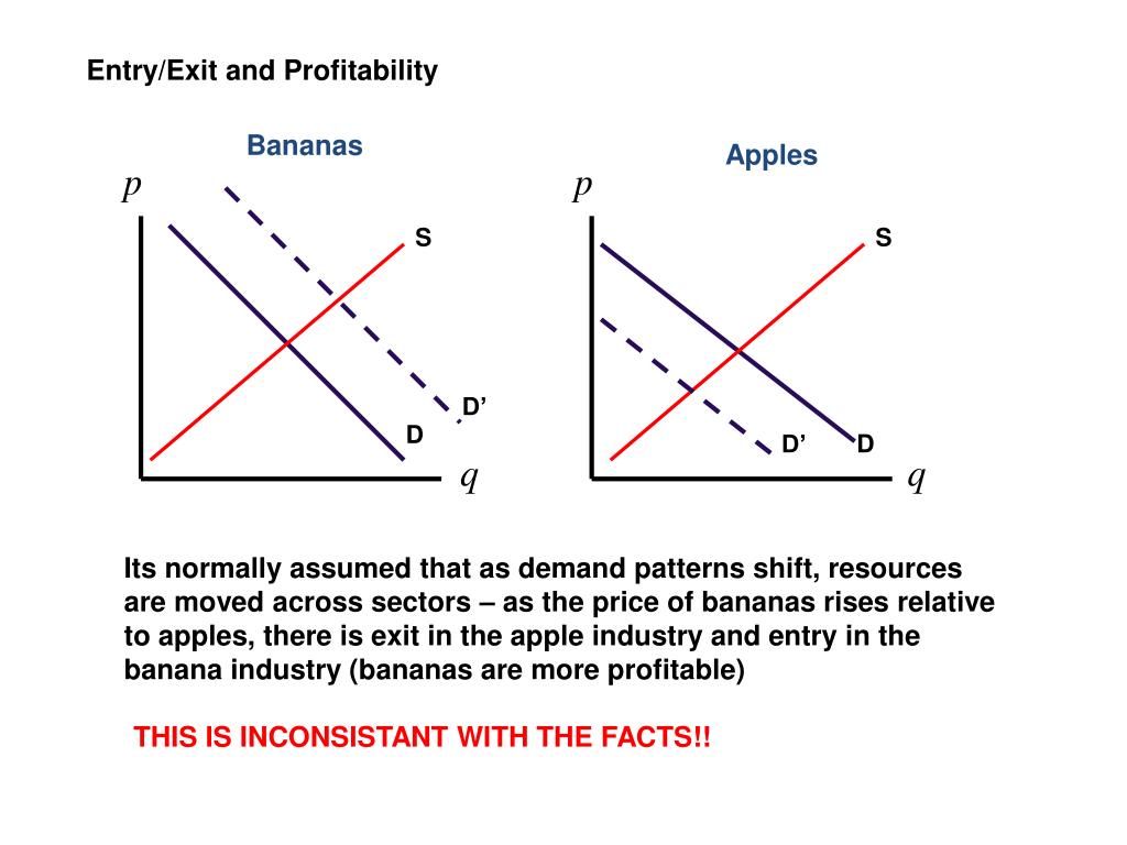 Entry/Exit and Profitability Bananas Apples S S D’ D D’ D Its normally assumed that as demand patterns shift, resources are moved across sectors – as the price of bananas rises relative to apples, there is exit in the apple industry and entry in the banana industry (bananas are more profitable) THIS IS INCONSISTANT WITH THE FACTS!!