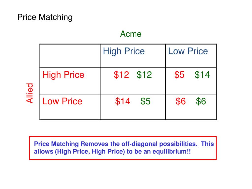 Price Matching Acme Allied Price Matching Removes the off-diagonal possibilities. This allows (High Price, High Price) to be an equilibrium!!