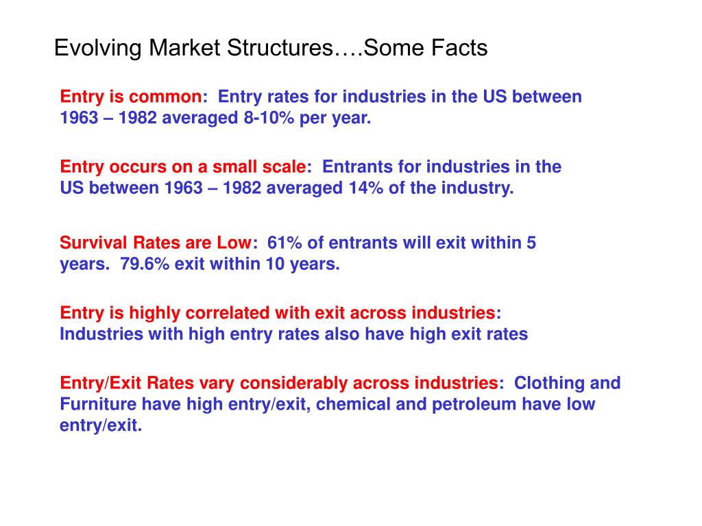 Evolving Market Structures….Some Facts Entry is common: Entry rates for industries in the US between 1963 – 1982 averaged 8-10% per year. Entry occurs on a small scale: Entrants for industries in the US between 1963 – 1982 averaged 14% of the industry. Survival Rates are Low: 61% of entrants will exit within 5 years. 79.6% exit within 10 years. Entry is highly correlated with exit across industries: Industries with high entry rates also have high exit rates Entry/Exit Rates vary considerably across industries: Clothing and Furniture have high entry/exit, chemical and petroleum have low entry/exit.