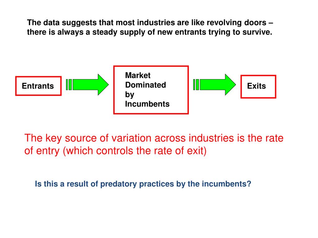 The data suggests that most industries are like revolving doors – there is always a steady supply of new entrants trying to survive. Market Dominated by Incumbents Entrants Exits The key source of variation across industries is the rate of entry (which controls the rate of exit) Is this a result of predatory practices by the incumbents?