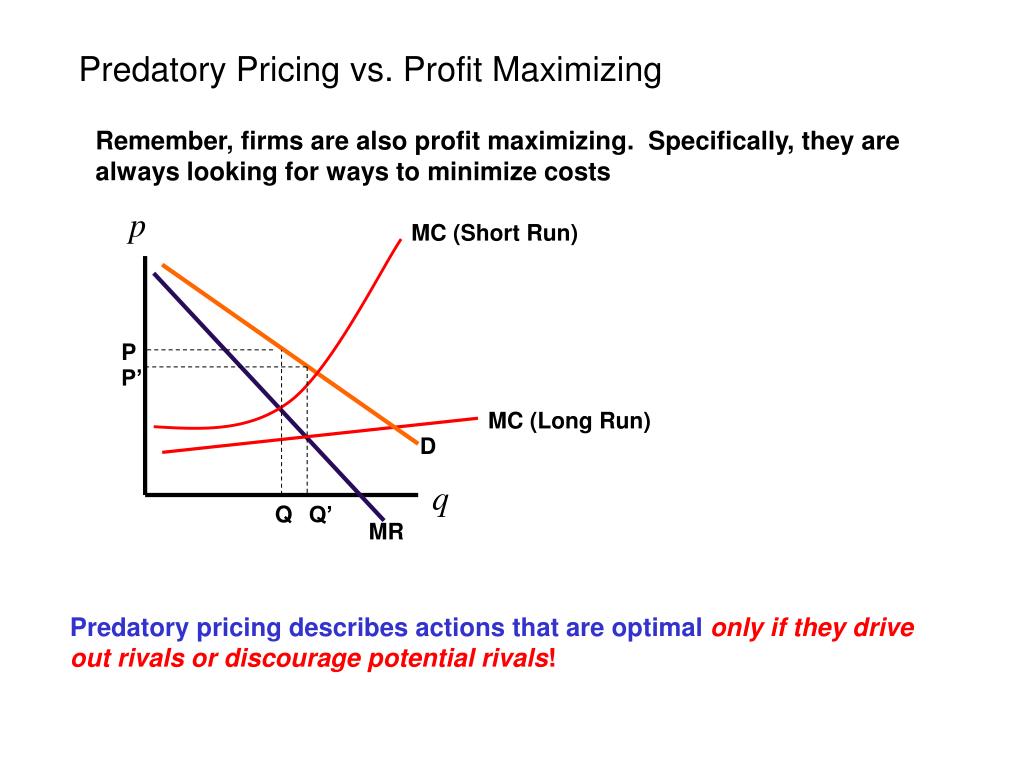 Predatory Pricing vs. Profit Maximizing Remember, firms are also profit maximizing. Specifically, they are always looking for ways to minimize costs MC (Short Run) P P’ MC (Long Run) D Q Q’ MR Predatory pricing describes actions that are optimal only if they drive out rivals or discourage potential rivals!