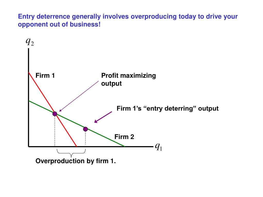 Entry deterrence generally involves overproducing today to drive your opponent out of business! Firm 1 Profit maximizing output Firm 1’s “entry deterring” output Firm 2 Overproduction by firm 1.