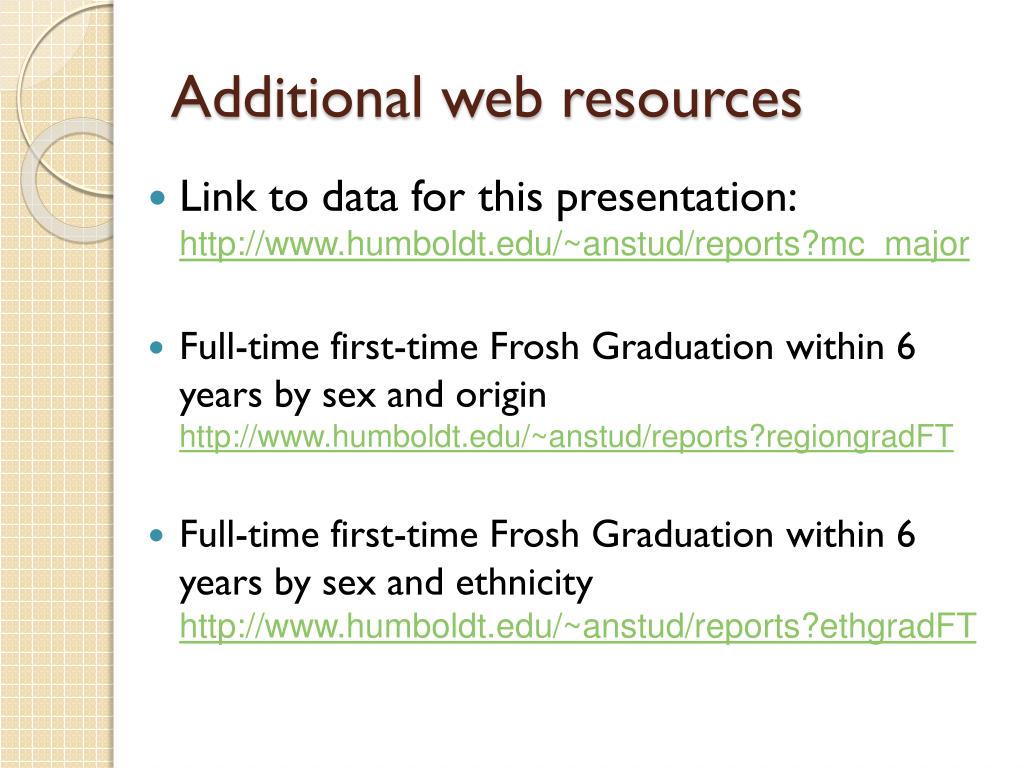 Additional web resources • Link to data for this presentation: http://www.humboldt.edu/~anstud/reports?mc_major • Full-time first-time Frosh Graduation within 6 years by sex and origin http://www.humboldt.edu/~anstud/reports?regiongradFT • Full-time first-time Frosh Graduation within 6 years by sex and ethnicity http://www.humboldt.edu/~anstud/reports?ethgradFT