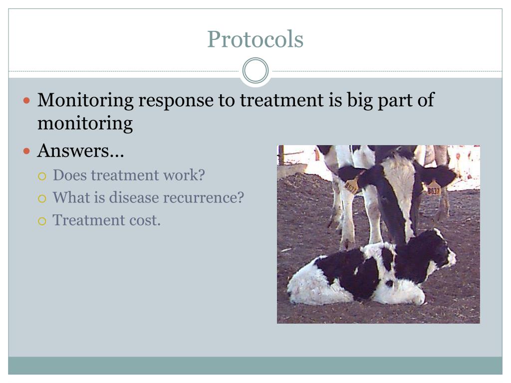 Protocols Protocols required to treat cows consistently Created based on case definition For example a treatment protocol for a cow that has one flake identified in her milk will be different than a protocol for a cow laterally recumbent from mastitis.