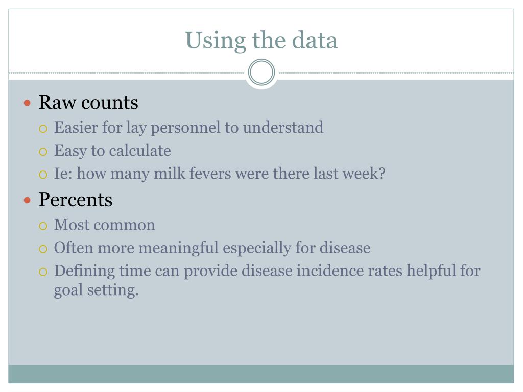 Using the data • Raw counts • Easier for lay personnel to understand • Easy to calculate • Ie: how many milk fevers were there last week? • Percents • Most common • Often more meaningful especially for disease • Defining time can provide disease incidence rates helpful for goal setting.