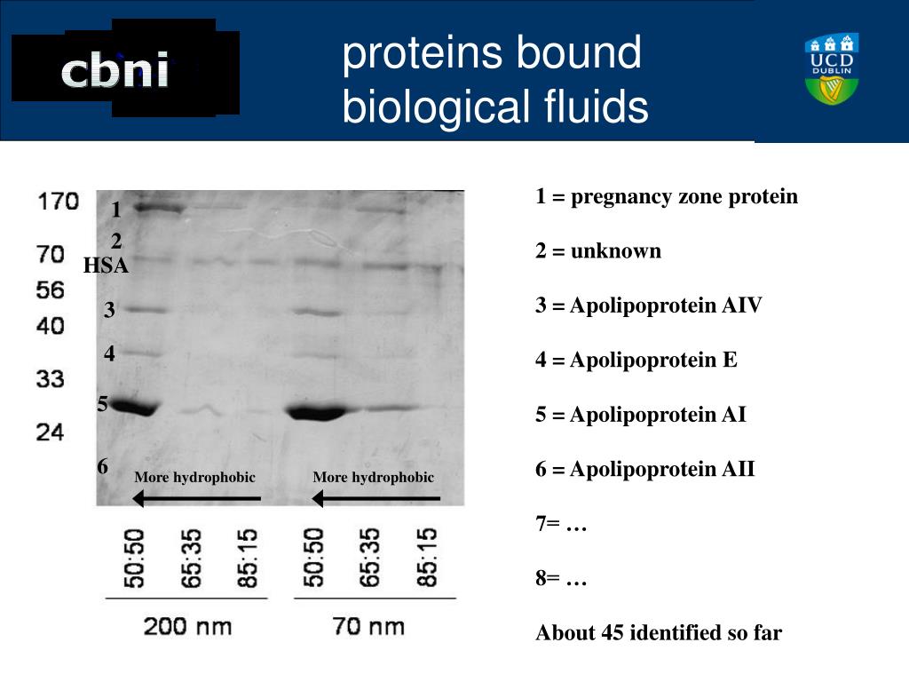 1 2 HSA 3 4 5 6 More hydrophobic More hydrophobic proteins bound biological fluids 1 = pregnancy zone protein 2 = unknown 3 = Apolipoprotein AIV 4 = Apolipoprotein E 5 = Apolipoprotein AI 6 = Apolipoprotein AII 7= … 8= … About 45 identified so far