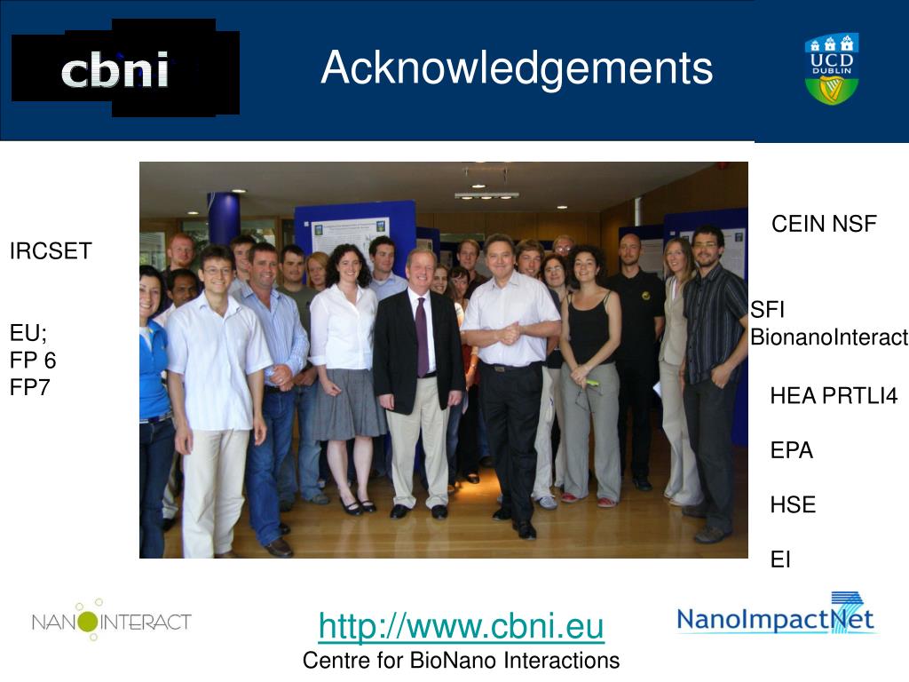 Acknowledgements IRCSET EU; FP 6 FP7 CEIN NSF SFI BionanoInteract HEA PRTLI4 EPA HSE EI http://www.cbni.eu Centre for BioNano Interactions