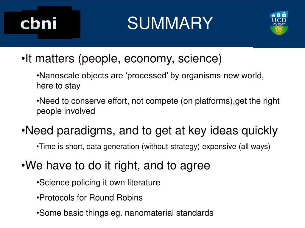 SUMMARY • It matters (people, economy, science) • Nanoscale objects are ‘processed’ by organisms-new world, here to stay • Need to conserve effort, not compete (on platforms),get the right people involved • Need paradigms, and to get at key ideas quickly • Time is short, data generation (without strategy) expensive (all ways) • We have to do it right, and to agree • Science policing it own literature • Protocols for Round Robins • Some basic things eg. nanomaterial standards