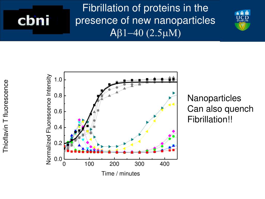 Fibrillation of proteins in the presence of new nanoparticles Ab1-40 (2.5mM) Nanoparticles Can also quench Fibrillation!! Thioflavin T fluorescence