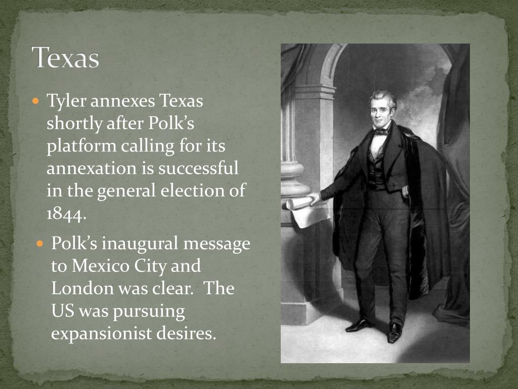 Texas • Tyler annexes Texas shortly after Polk’s platform calling for its annexation is successful in the general election of 1844. • Polk’s inaugural message to Mexico City and London was clear. The US was pursuing expansionist desires.