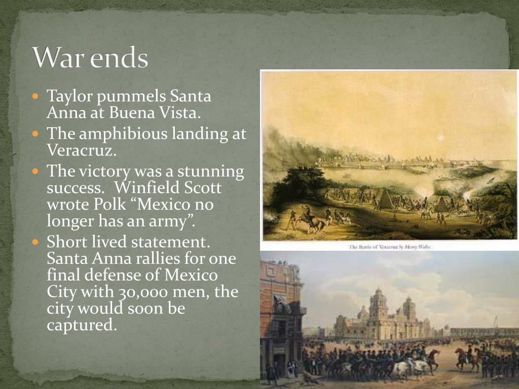 War ends • Taylor pummels Santa Anna at Buena Vista. • The amphibious landing at Veracruz. • The victory was a stunning success. Winfield Scott wrote Polk “Mexico no longer has an army”. • Short lived statement. Santa Anna rallies for one final defense of Mexico City with 30,000 men, the city would soon be captured.