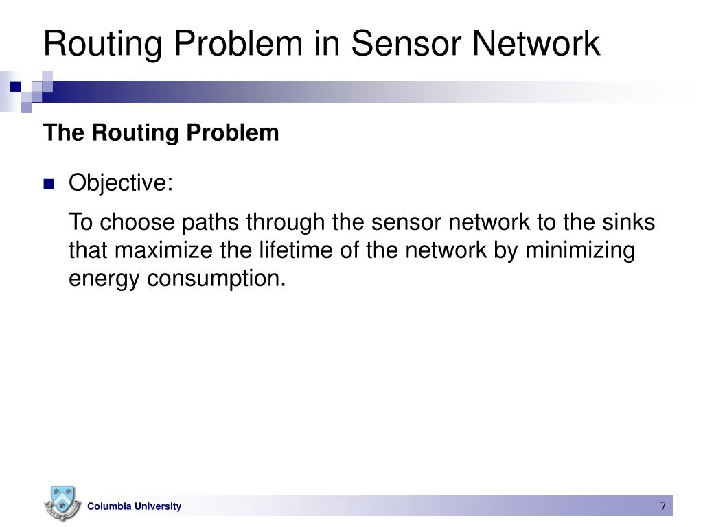 Routing Problem in Sensor Network The Routing Problem • Objective: To choose paths through the sensor network to the sinks that maximize the lifetime of the network by minimizing energy consumption.
