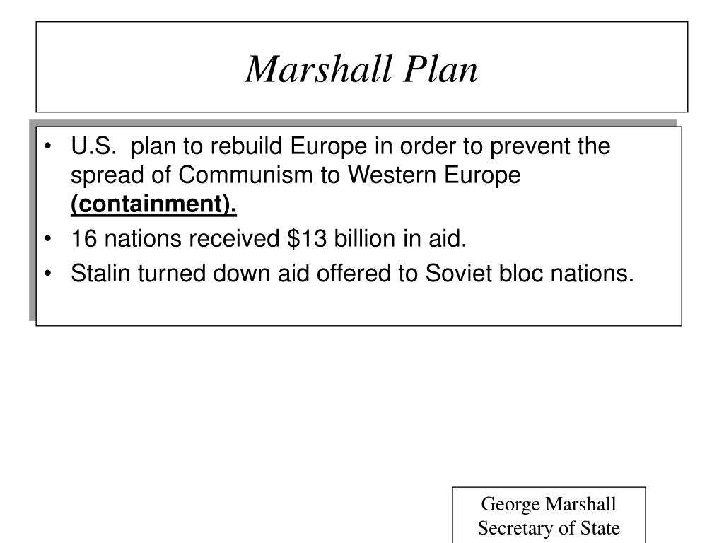 Marshall Plan U.S. plan to rebuild Europe in order to prevent the spread of Communism to Western Europe (containment). 16 nations received $13 billion in aid. Stalin turned down aid offered to Soviet bloc nations. George Marshall Secretary of State