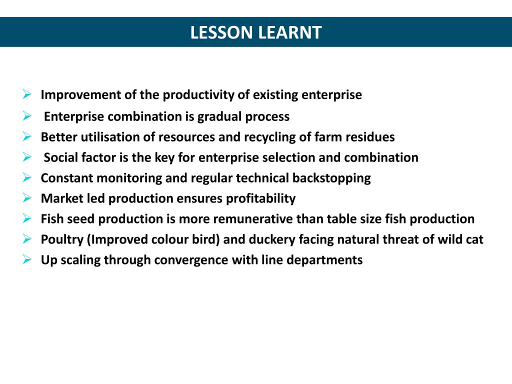 LESSON LEARNT • Improvement of the productivity of existing enterprise • Enterprise combination is gradual process • Better utilisation of resources and recycling of farm residues • Social factor is the key for enterprise selection and combination • Constant monitoring and regular technical backstopping • Market led production ensures profitability • Fish seed production is more remunerative than table size fish production • Poultry (Improved colour bird) and duckery facing natural threat of wild cat • Up scaling through convergence with line departments