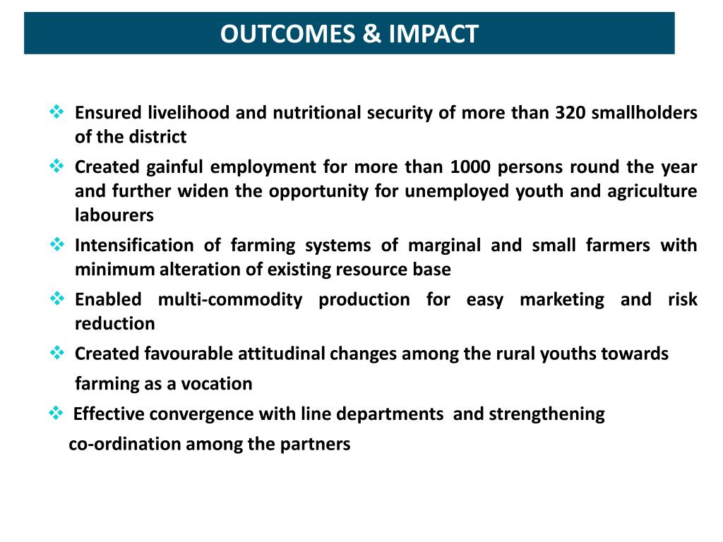 OUTCOMES & IMPACT • Ensured livelihood and nutritional security of more than 320 smallholders of the district • Created gainful employment for more than 1000 persons round the year and further widen the opportunity for unemployed youth and agriculture labourers • Intensification of farming systems of marginal and small farmers with minimum alteration of existing resource base • Enabled multi-commodity production for easy marketing and risk reduction • Created favourable attitudinal changes among the rural youths towards farming as a vocation • Effective convergence with line departments and strengthening co-ordination among the partners