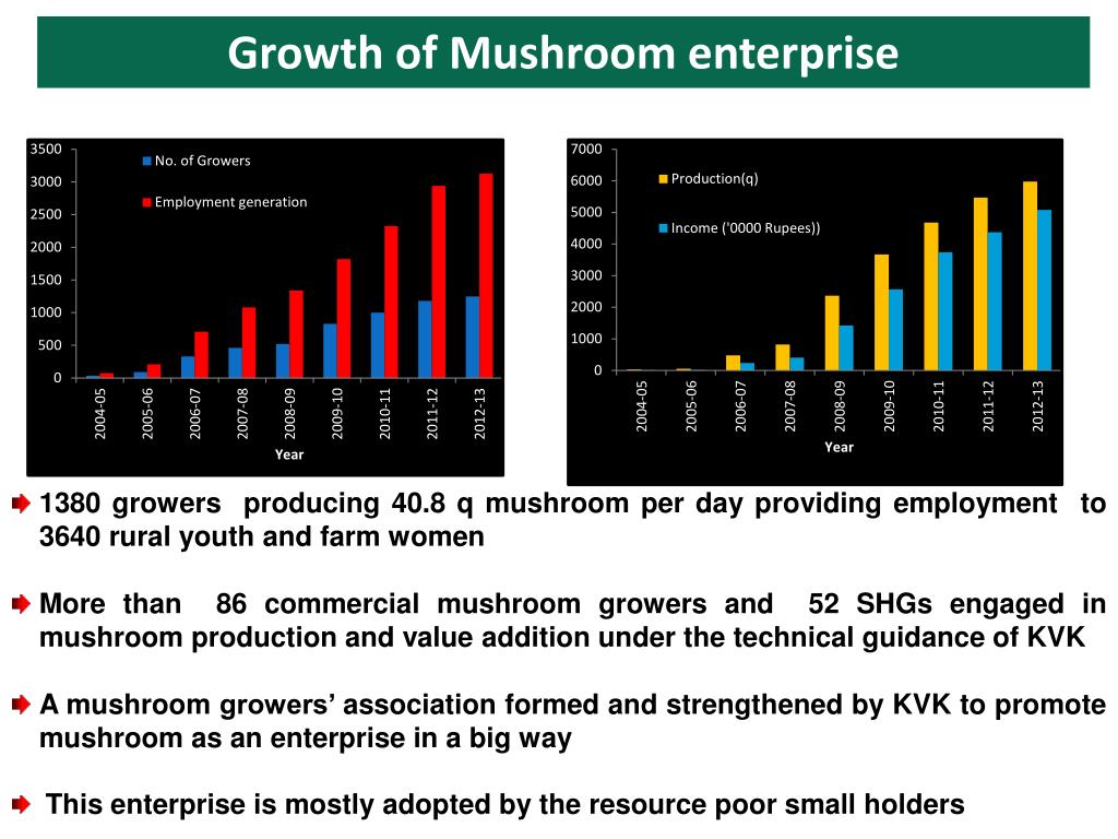 Growth of Mushroom enterprise • 1380 growers producing 40.8 q mushroom per day providing employment to 3640 rural youth and farm women • More than 86 commercial mushroom growers and 52 SHGs engaged in mushroom production and value addition under the technical guidance of KVK • A mushroom growers’ association formed and strengthened by KVK to promote mushroom as an enterprise in a big way • This enterprise is mostly adopted by the resource poor small holders