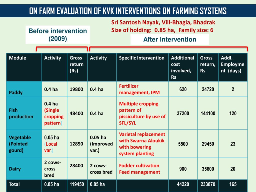 ON FARM EVALUATION OF KVK INTERVENTIONS ON FARMING SYSTEMS Rabi NarayanBarik Maitapur, Bhadrak) Size of holding: 0.9 ha Family size: 6 Enterprises before intervention Specific Intervention on 1st year Fertilizer management, IPM Use of SFL/SYL, supplementary feeding, INM, IDM Fodder cultivation and Feed management