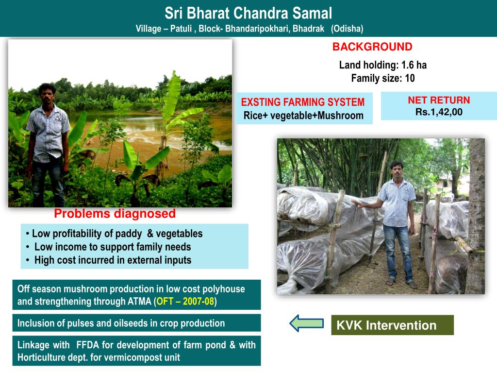 Sri Bharat Chandra Samal Village – Patuli , Block- Bhandaripokhari, Bhadrak (Odisha) BACKGROUND Land holding: 1.6 ha Family size: 10 NET RETURN Rs.1,42,00 • EXSTING FARMING SYSTEM • Rice+ vegetable+Mushroom Problems diagnosed • Low profitability of paddy & vegetables • Low income to support family needs • High cost incurred in external inputs • Off season mushroom production in low cost polyhouse and strengthening through ATMA (OFT – 2007-08) Inclusion of pulses and oilseeds in crop production KVK Intervention • Linkage with FFDA for development of farm pond & with Horticulture dept. for vermicompost unit
