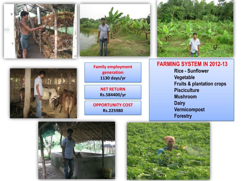 FARMING SYSTEM IN 2012-13 • Rice - Sunflower • Vegetable • Fruits & plantation crops • Pisciculture • Mushroom • Dairy • Vermicompost • Forestry Family employment generation 1130 days/yr NET RETURN Rs.584400/yr OPPORTUNITY COST Rs.225980