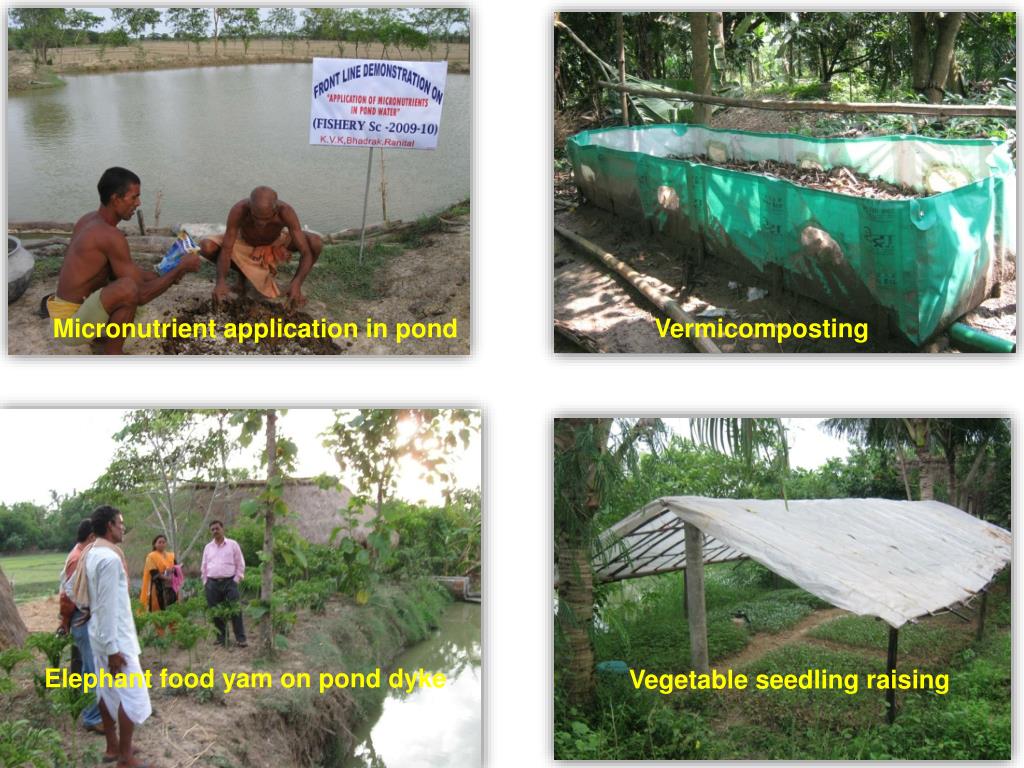 Micronutrient application in pond Vermicomposting Elephant food yam on pond dyke Vegetable seedling raising