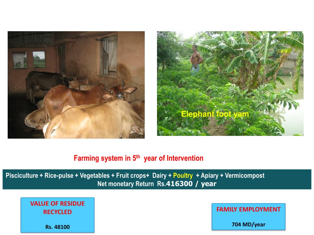 Elephant foot yam Farming system in 5thyear of Intervention Pisciculture + Rice-pulse + Vegetables + Fruit crops+ Dairy + Poultry+ Apiary + Vermicompost Net monetary Return Rs.416300 / year VALUE OF RESIDUE RECYCLED Rs. 48100 FAMILY EMPLOYMENT 704 MD/year