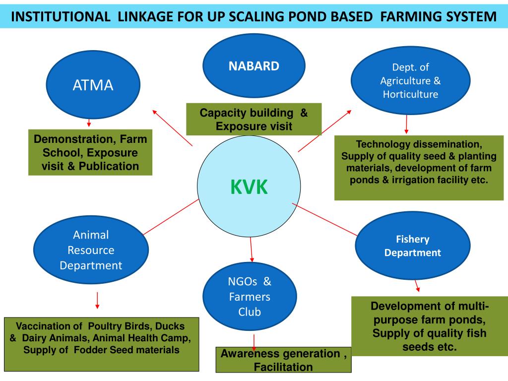 STRATEGY FOLLOWED BY KVK TO PROMOTE INTEGRATED FARMING SYSTEM S FOR SMALL HOLDERS Identification of existing pond based farming systems Analyzing the economics, social and component compatibility, resource use, residue recycling and constraints Technology intervention for maximizing the out put of individual components and optimizing system productivity Assessing the sustainability of the farming systems and documentation of threats and constraints Validating the suitability of the situation specific pond based farming system models at different locations Creating gainful employment opportunity through processing and value addition Convergence and institutional linkage for strengthening and horizontal spread of the technology