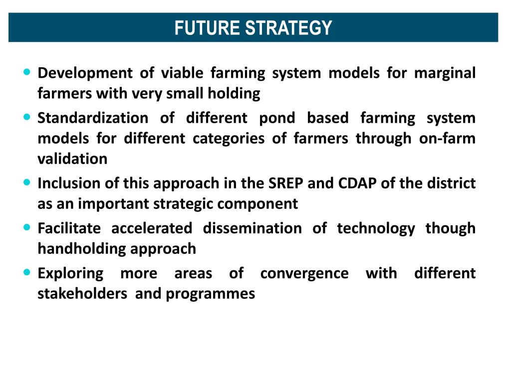 FUTURE STRATEGY • Development of viable farming system models for marginal farmers with very small holding • Standardization of different pond based farming system models for different categories of farmers through on-farm validation • Inclusion of this approach in the SREP and CDAP of the district as an important strategic component • Facilitate accelerated dissemination of technology though handholding approach • Exploring more areas of convergence with different stakeholders and programmes