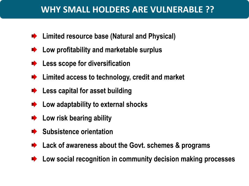 WHY SMALL HOLDERS ARE VULNERABLE ?? Limited resource base (Natural and Physical) Low profitability and marketable surplus Less scope for diversification Limited access to technology, credit and market Less capital for asset building Low adaptability to external shocks Low risk bearing ability Subsistence orientation Lack of awareness about the Govt. schemes & programs Low social recognition in community decision making processes