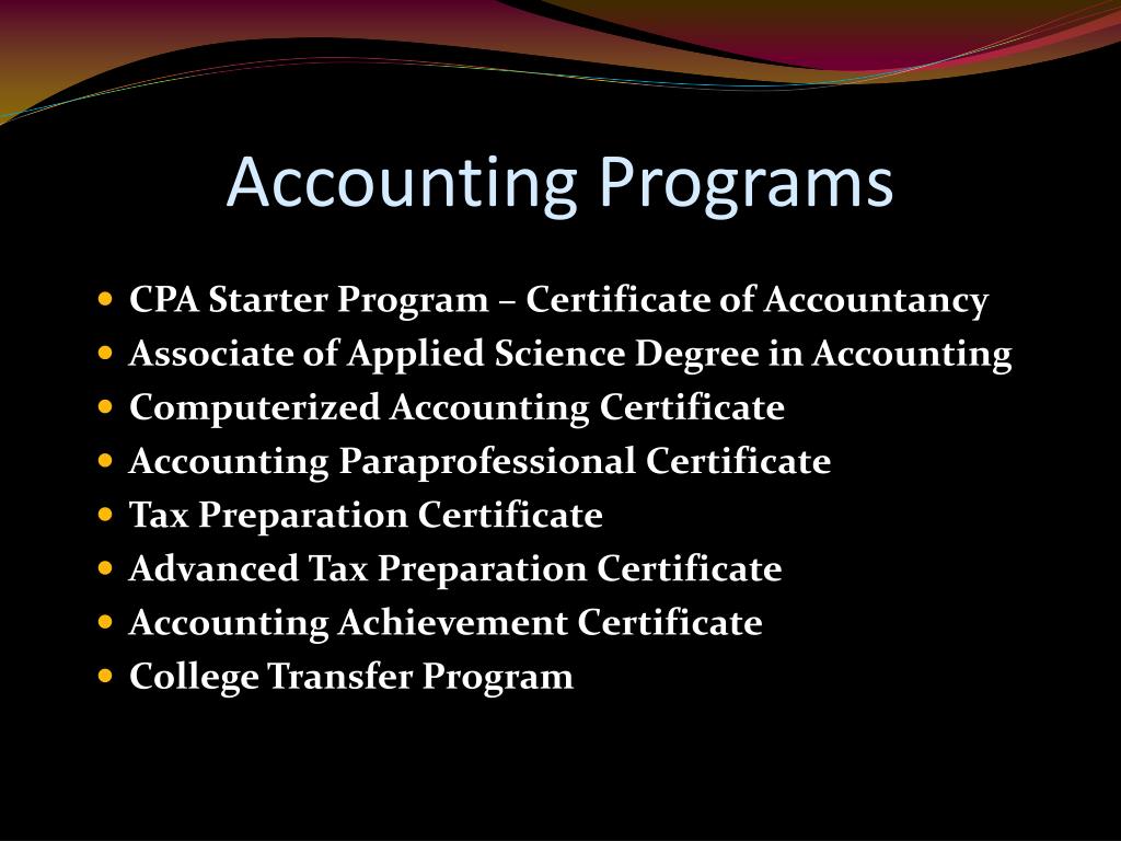 Accounting Programs • CPA Starter Program – Certificate of Accountancy • Associate of Applied Science Degree in Accounting • Computerized Accounting Certificate • Accounting Paraprofessional Certificate • Tax Preparation Certificate • Advanced Tax Preparation Certificate • Accounting Achievement Certificate • College Transfer Program