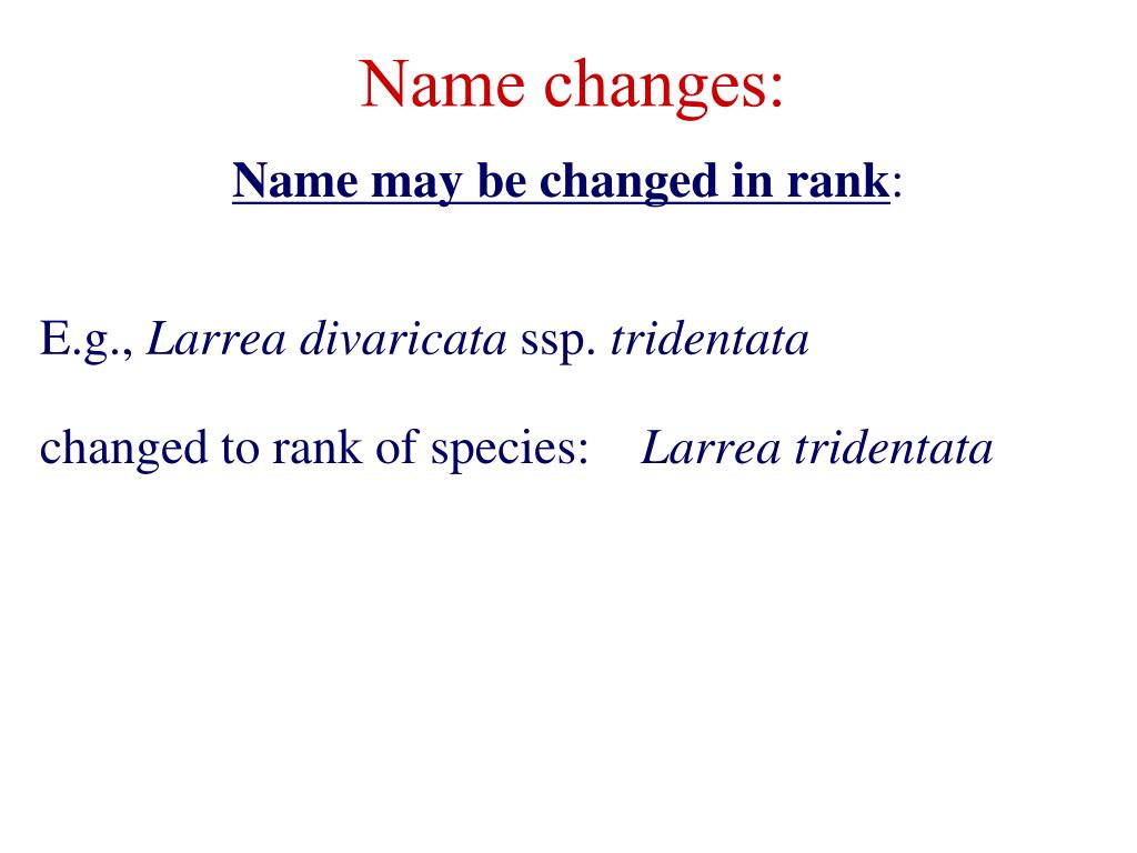 Name changes: Name may be changed in rank: E.g., Larrea divaricata ssp. tridentata changed to rank of species: Larrea tridentata