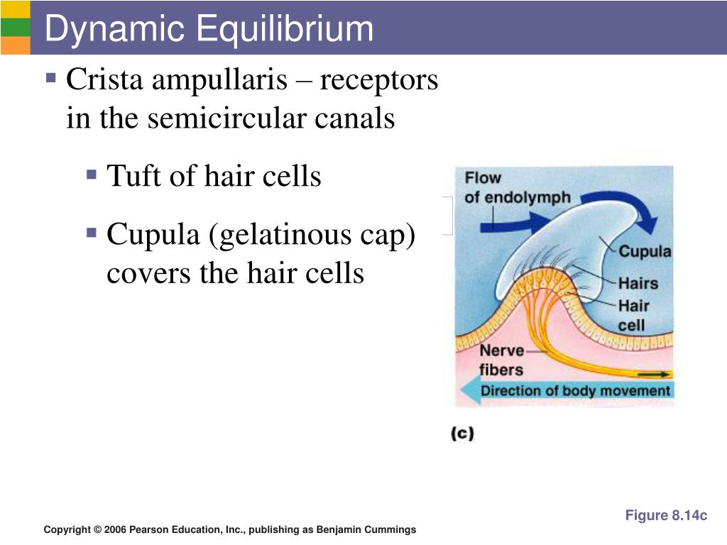 Dynamic Equilibrium • Crista ampullaris – receptors in the semicircular canals • Tuft of hair cells • Cupula (gelatinous cap) covers the hair cells Figure 8.14c