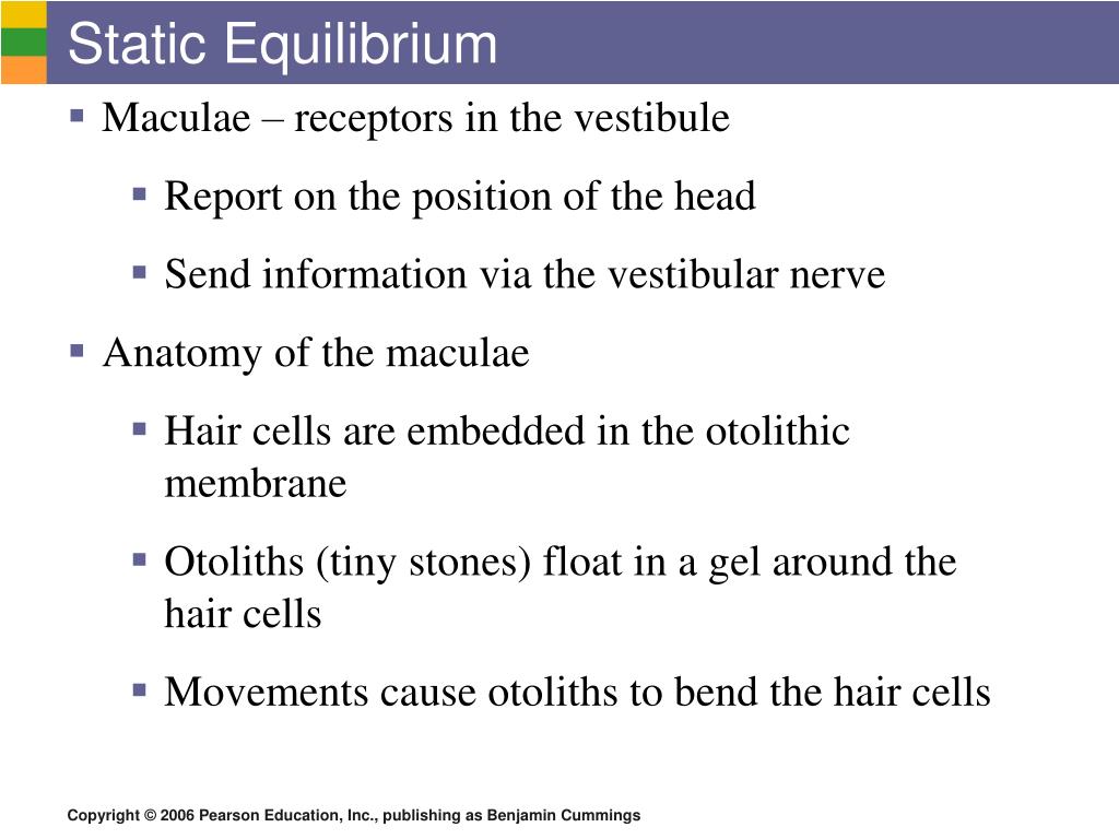 Static Equilibrium • Maculae – receptors in the vestibule • Report on the position of the head • Send information via the vestibular nerve • Anatomy of the maculae • Hair cells are embedded in the otolithic membrane • Otoliths (tiny stones) float in a gel around the hair cells • Movements cause otoliths to bend the hair cells