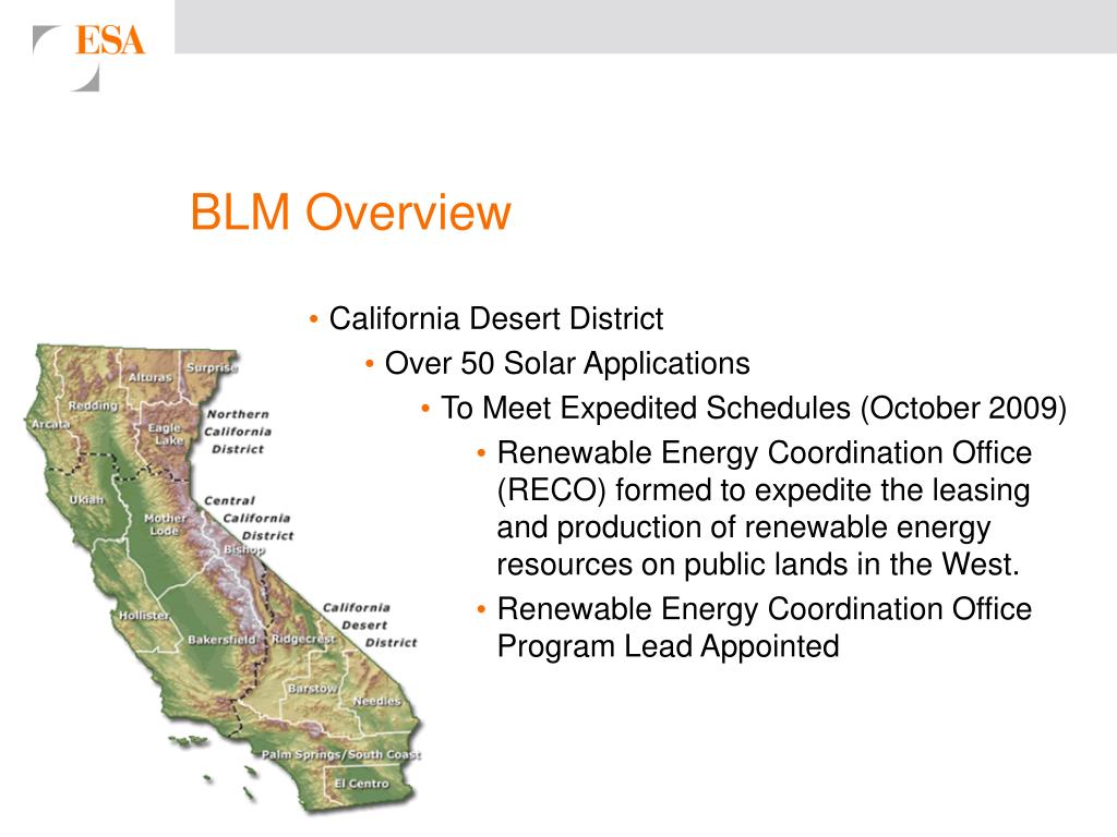 BLM Overview • California Desert District • Over 50 Solar Applications • To Meet Expedited Schedules (October 2009) • Renewable Energy Coordination Office (RECO) formed to expedite the leasing and production of renewable energy resources on public lands in the West. • Renewable Energy Coordination Office Program Lead Appointed