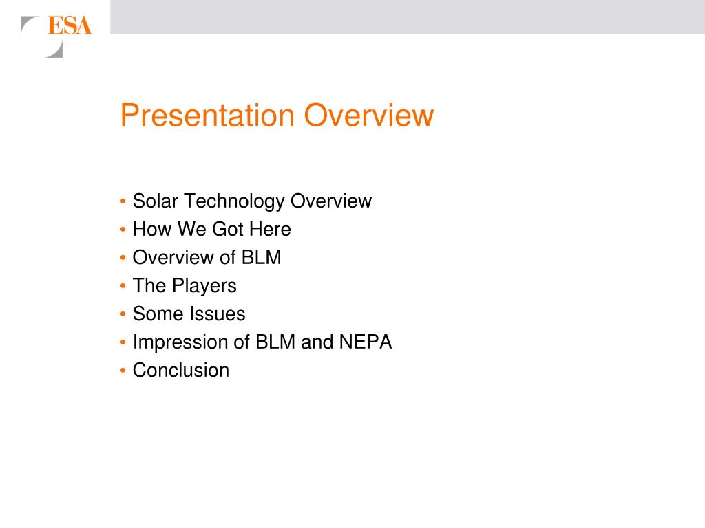 Presentation Overview • Solar Technology Overview • How We Got Here • Overview of BLM • The Players • Some Issues • Impression of BLM and NEPA • Conclusion