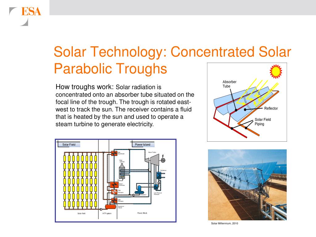 Solar Technology: Concentrated Solar Parabolic Troughs How troughs work: Solar radiation is concentrated onto an absorber tube situated on the focal line of the trough. The trough is rotated east-west to track the sun. The receiver contains a fluid that is heated by the sun and used to operate a steam turbine to generate electricity. Solar Millennium, 2010