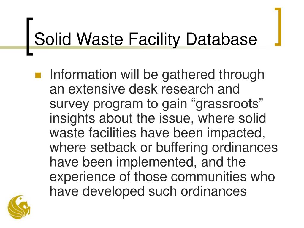 Solid Waste Facility Database • Information will be gathered through an extensive desk research and survey program to gain “grassroots” insights about the issue, where solid waste facilities have been impacted, where setback or buffering ordinances have been implemented, and the experience of those communities who have developed such ordinances