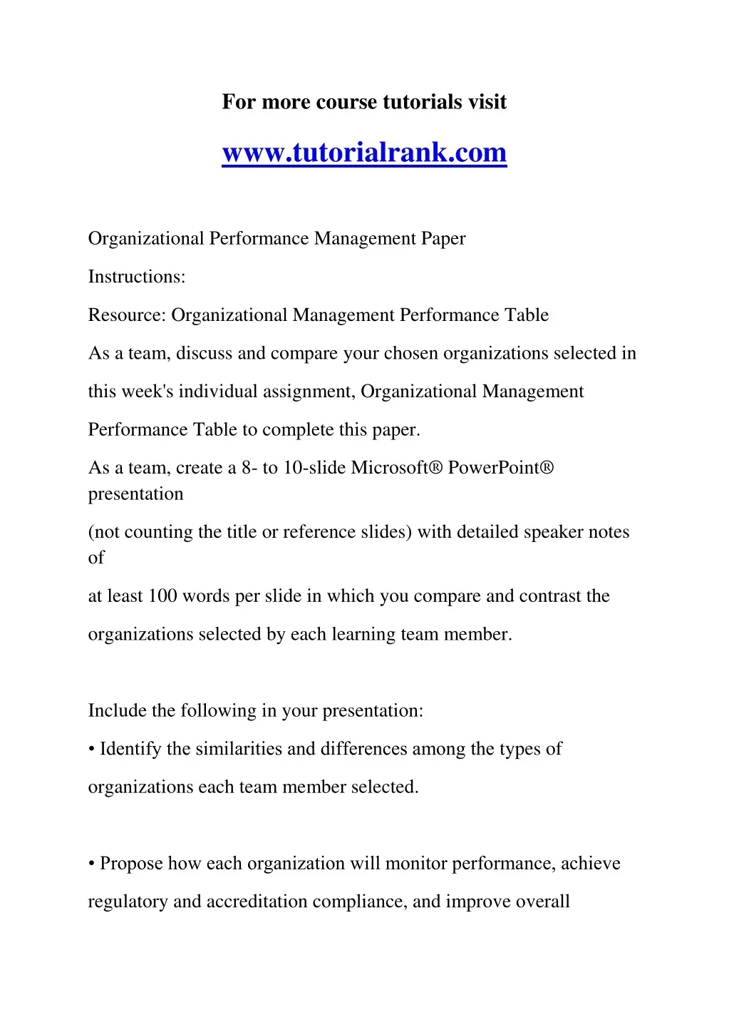For more course tutorials visit www.tutorialrank.com Organizational Performance Management Paper Instructions: Resource: Organizational Management Performance Table As a team, discuss and compare your chosen organizations selected in this week's individual assignment, Organizational Management Performance Table to complete this paper. As a team, create a 8- to 10-slide Microsoft® PowerPoint® presentation (not counting the title or reference slides) with detailed speaker notes of at least 100 words per slide in which you compare and contrast the organizations selected by each learning team member. Include the following in your presentation: • Identify the similarities and differences among the types of organizations each team member selected. • Propose how each organization will monitor performance, achieve regulatory and accreditation compliance, and improve overall