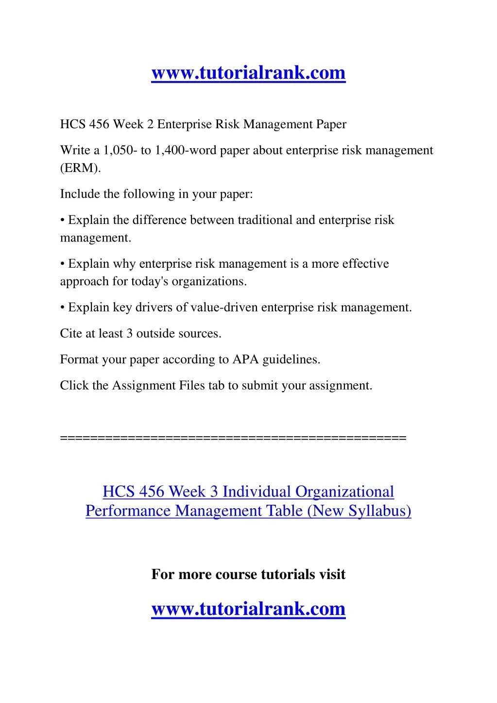 www.tutorialrank.com HCS 456 Week 2 Enterprise Risk Management Paper Write a 1,050- to 1,400-word paper about enterprise risk management (ERM). Include the following in your paper: • Explain the difference between traditional and enterprise risk management. • Explain why enterprise risk management is a more effective approach for today's organizations. • Explain key drivers of value-driven enterprise risk management. Cite at least 3 outside sources. Format your paper according to APA guidelines. Click the Assignment Files tab to submit your assignment. ============================================== HCS 456 Week 3 Individual Organizational Performance Management Table (New Syllabus) For more course tutorials visit www.tutorialrank.com