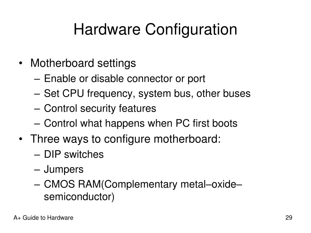 Hardware Configuration • Motherboard settings • Enable or disable connector or port • Set CPU frequency, system bus, other buses • Control security features • Control what happens when PC first boots • Three ways to configure motherboard: • DIP switches • Jumpers • CMOS RAM(Complementary metal–oxide–semiconductor) A+ Guide to Hardware