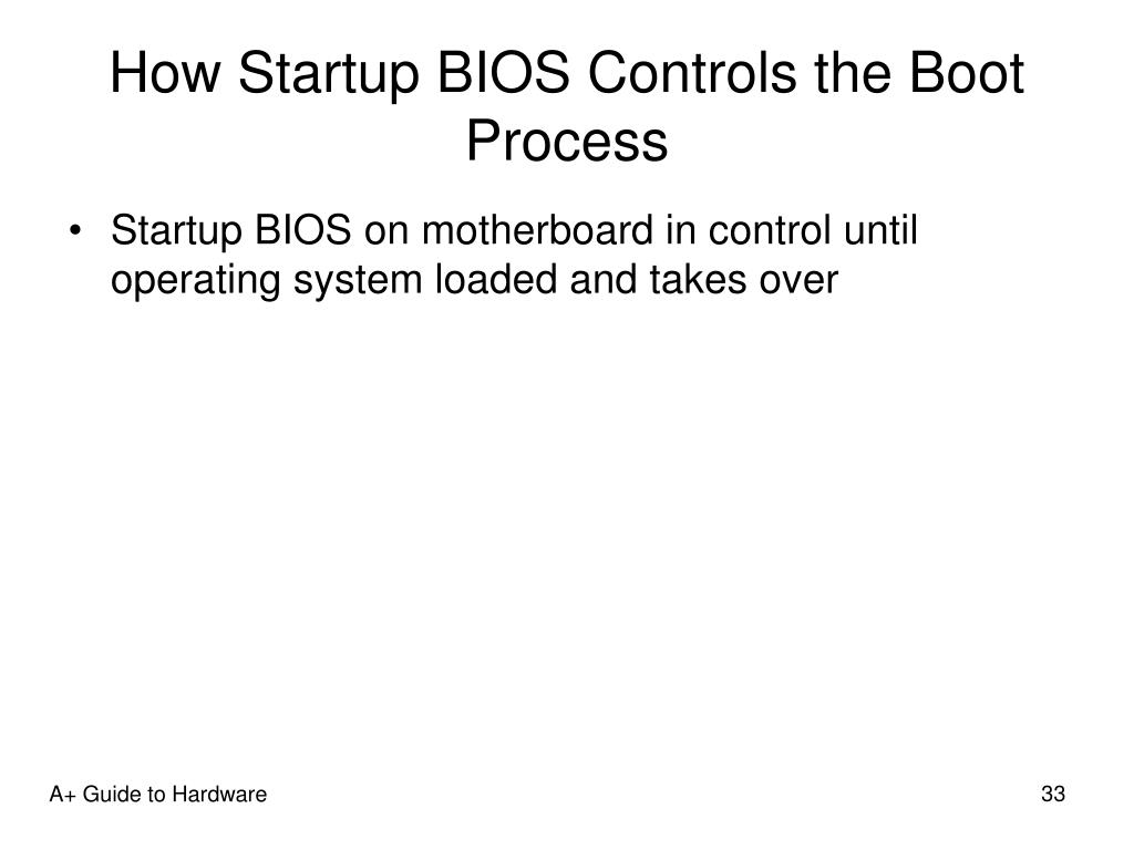 How Startup BIOS Controls the Boot Process • Startup BIOS on motherboard in control until operating system loaded and takes over A+ Guide to Hardware