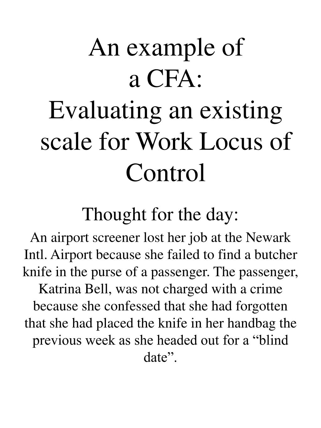 An example of a CFA:Evaluating an existingscale for Work Locus of Control Thought for the day: An airport screener lost her job at the Newark Intl. Airport because she failed to find a butcher knife in the purse of a passenger. The passenger, Katrina Bell, was not charged with a crime because she confessed that she had forgotten that she had placed the knife in her handbag the previous week as she headed out for a “blind date”.