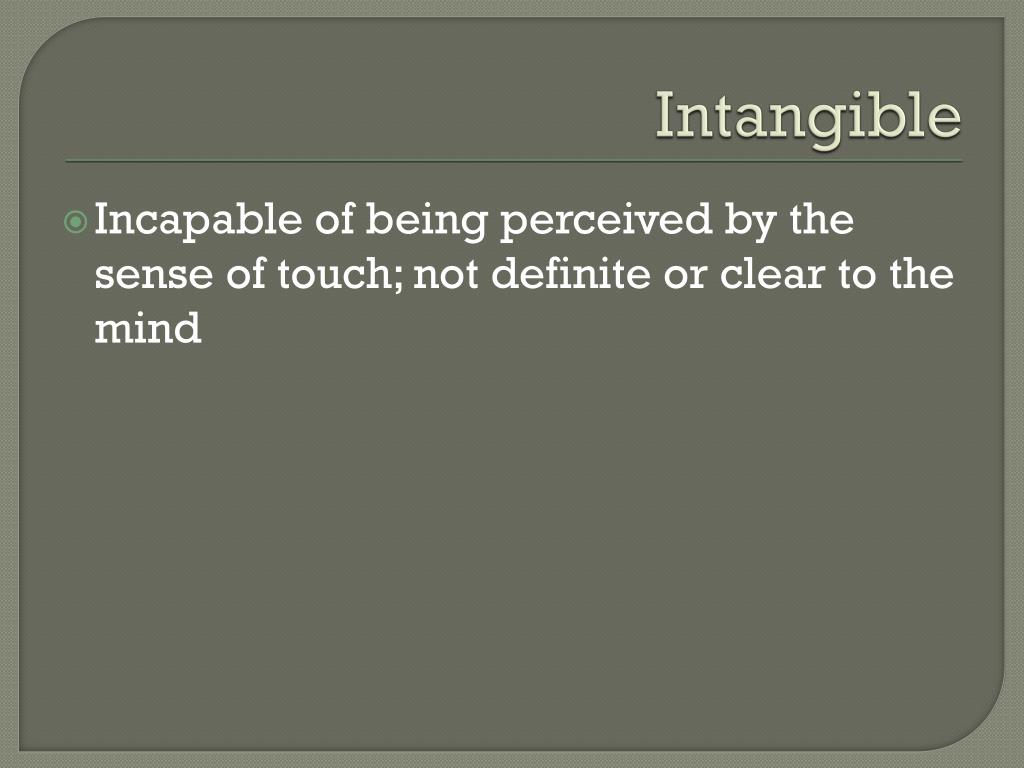 Intangible Incapable of being perceived by the sense of touch; not definite or clear to the mind