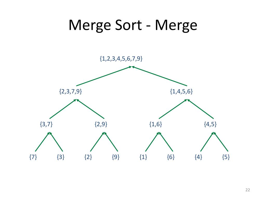 {2,3,7,9} {1,4,5,6} {3,7} {2,9} {1,6} {4,5} {7} {3} {2} {9} {1} {6} {4} {5} Merge Sort - Merge {1,2,3,4,5,6,7,9}