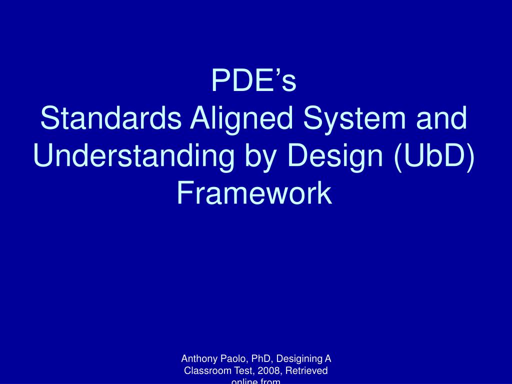 PDE’s Standards Aligned System and Understanding by Design (UbD) Framework Anthony Paolo, PhD, Desigining A Classroom Test, 2008, Retrieved online from http://www2.kumc.edu/comptraining/documents/DesigningaClassroomtest.ppt