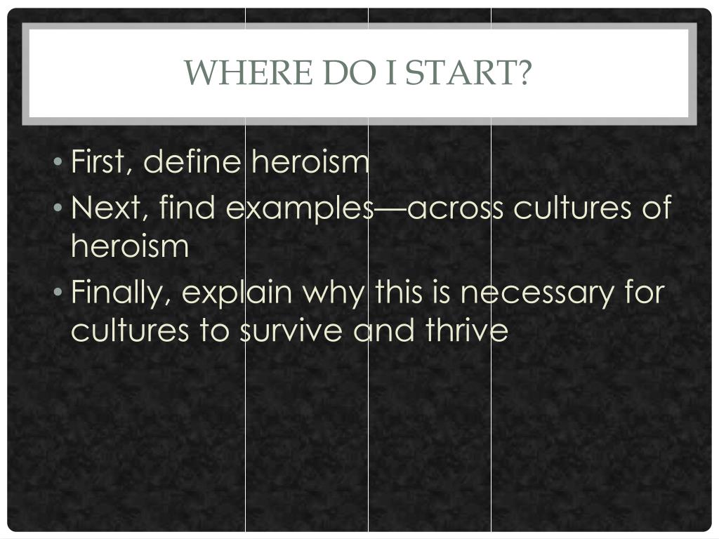 Where do I start? • First, define heroism • Next, find examples—across cultures of heroism • Finally, explain why this is necessary for cultures to survive and thrive