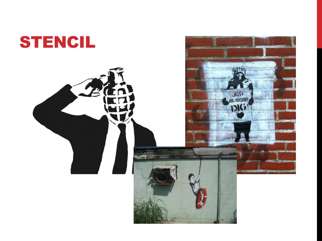 Street ART • Udover vægmalerier har Street art mange facetter og kan være alt lige fra klistermærker, til plakater, til stencils, installationer i gadebilledet, perleplader, strik og legoklodser de mærkværdigste steder. • Street arten har ofte et budskab, og søger at kommunikere direkte til det almindelige menneske. • Det er ikke altid at budskabet er så alvorligt, det kan også bare være et humoristisk indslag i byrummet, som kun den opmærksomme opdager.